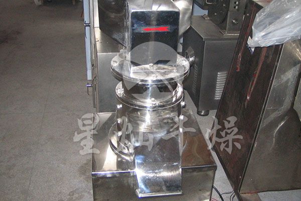 物料由进料斗送进粉碎室,经刀刃和刀座的冲击,旋转刀和固定刀同时剪切粉碎,由于受到旋转离心力的作用,物料自动从出口处流出。