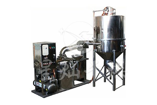 本机工作原理和传统中医研船,脚踏碾轮粉碎原理相同。碾轮在轨道上圆周滚动,加上适当压力,在反复碾轧的过程中使物料粉碎并达到需要的细度。由于碾轮双边刃口有剪切作用,也协同粉碎,特别是纤维性物料。粉碎过程中细的物料飘浮起来被风机吸入,排到旋风集料罐,布袋排出气体,成品料粉留在袋内。