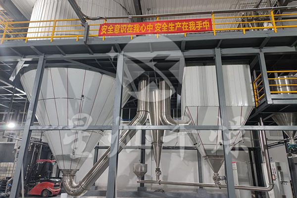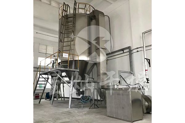 空气经过过滤和加热,进入干燥器顶部空气分配器,热空气呈螺旋状均匀地进入干燥室。料液经塔体顶部的高速离心雾化器,(旋转)喷雾成极细微的雾状液珠,与热空气并流接触,在极短的时间内可干燥为成品。成品连续地由干燥塔底部和旋风分离器中输出,废气由风机排空。