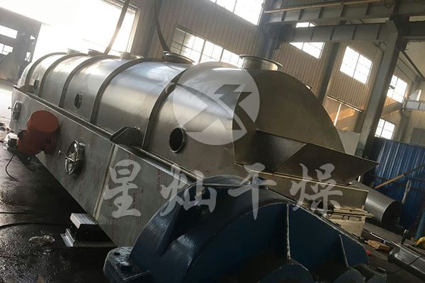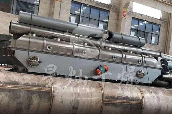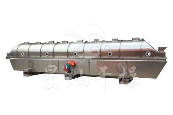 物料自进料口进入机内,在振动力作用下,物料沿水平流化床抛掷,向前连续运动,热风向上穿过流化床同湿物料换热后,湿空气经旋风分离器除尘后由排风口排出,干燥物料由排料口排出。
