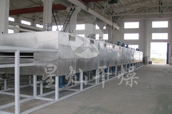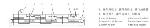 物料由加料器均匀地铺在网带上,网带一般采用12-60目不锈钢丝网,由传动装置拖动在干燥机内移动。干燥机由若干单元组成,每一单元热风独立循环,部分尾气由专门排湿风机排出,废气由调节阀控制,热气由下往上或由上往下穿过铺满物料的网带完成热量与质量传递的进程,带走物料水份。网带缓慢移动,运行速度可根据物料温度自由调节,干燥后的成品连续落入收料器中。上下循环单元根据用户需要可灵活配备,单元数量亦可根据需要选取。