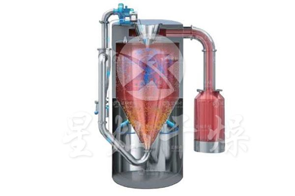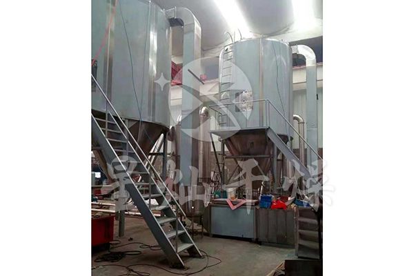 空气经过过滤和加热,进入干燥器顶部空气分配器,热空气呈螺旋状均匀地进入干燥室。料液经塔体顶部的高速离心雾化器,(旋转)喷雾成极细微的雾状液珠,与热空气并流接触,在极短的时间内可干燥为成品。成品连续地由干燥塔底部和旋风分离器中输出,废气由风机排空。