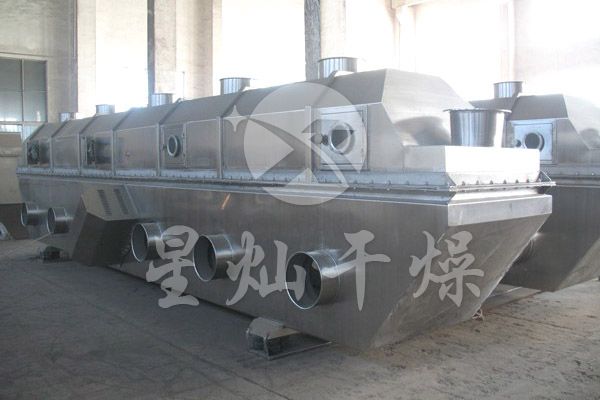 物料自进料口进入机内,在振动力作用下,物料沿水平流化床抛掷,向前连续运动,热风向上穿过流化床同湿物料换热后,湿空气经旋风分离器除尘后由排风口排出,干燥物料由排料口排出。
